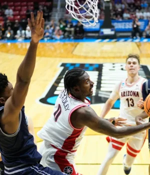 SAN DIEGO (AP) – Jaden Bradley marcou 12 de seus 18 pontos no segundo tempo, Matiejas Krivas fez 11 pontos e 14 rebotes e o melhor colocado Arizona venceu o nono colocado Utah State por 78-66 no domingo para passar para o doce quarto lugar da temporada L-16 sub-16.