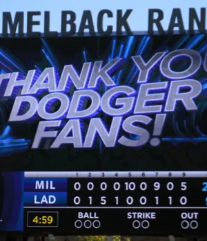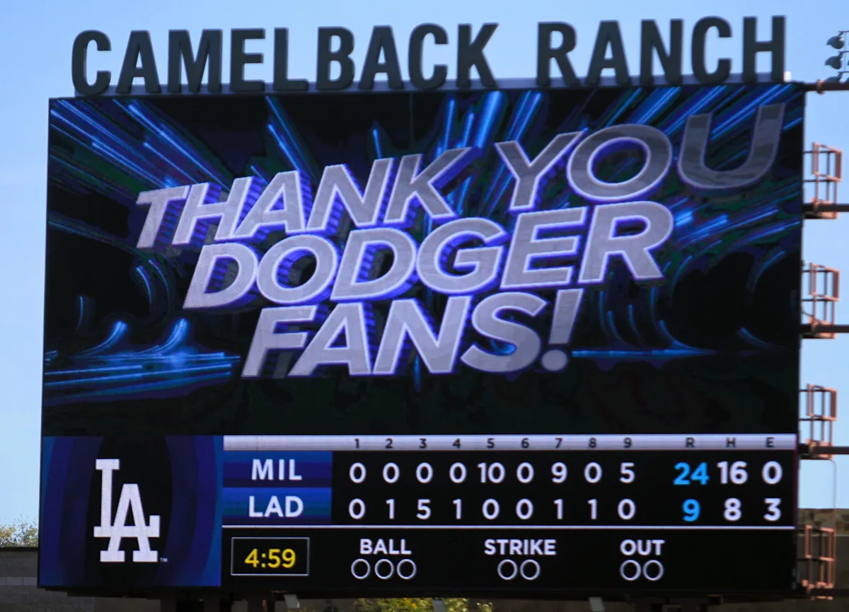 O placar do Camelback Ranch mostra a pontuação final do jogo de treinamento de primavera Brewers-Dodgers de 16 de março.
