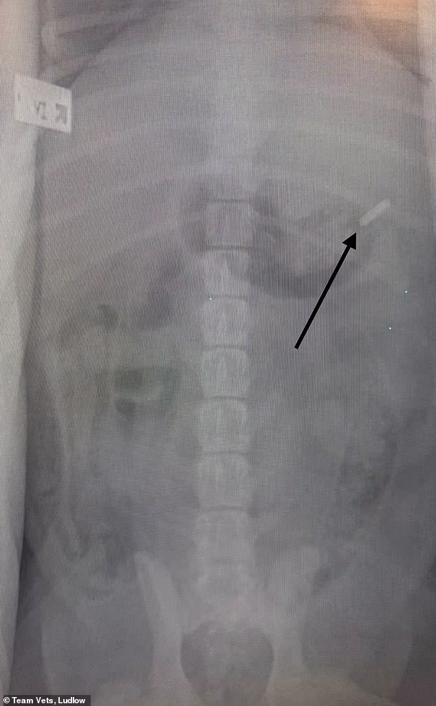 O cachorrinho de cinco meses foi levado ao veterinário na véspera de Ano Novo depois de engolir uma lâmina de uma lixeira de banheiro em uma casa em Ludlow, Shropshire.