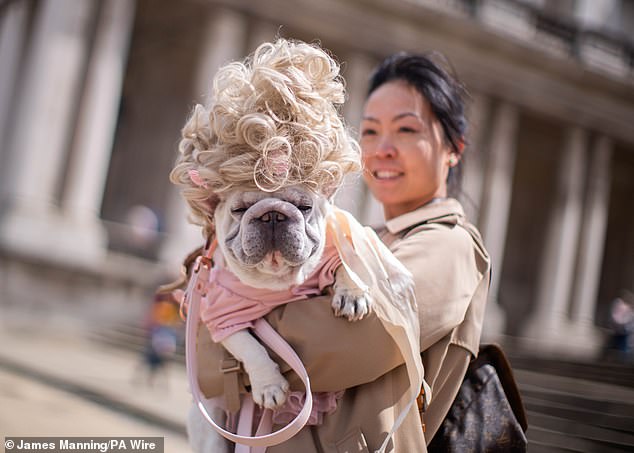 Enquanto isso, o bulldog francês Charlotte, que conquistou o segundo lugar no Brigarton Award, estava vestido com uma peruca tradicional com roupas rosa e líder combinando.