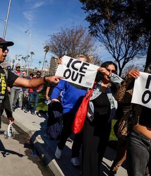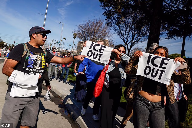 Os manifestantes agitaram faixas com os dizeres “ICE fora do Super Bowl” enquanto apelavam aos legisladores para “abolirem” a agência de Imigração e Fiscalização Aduaneira.