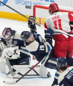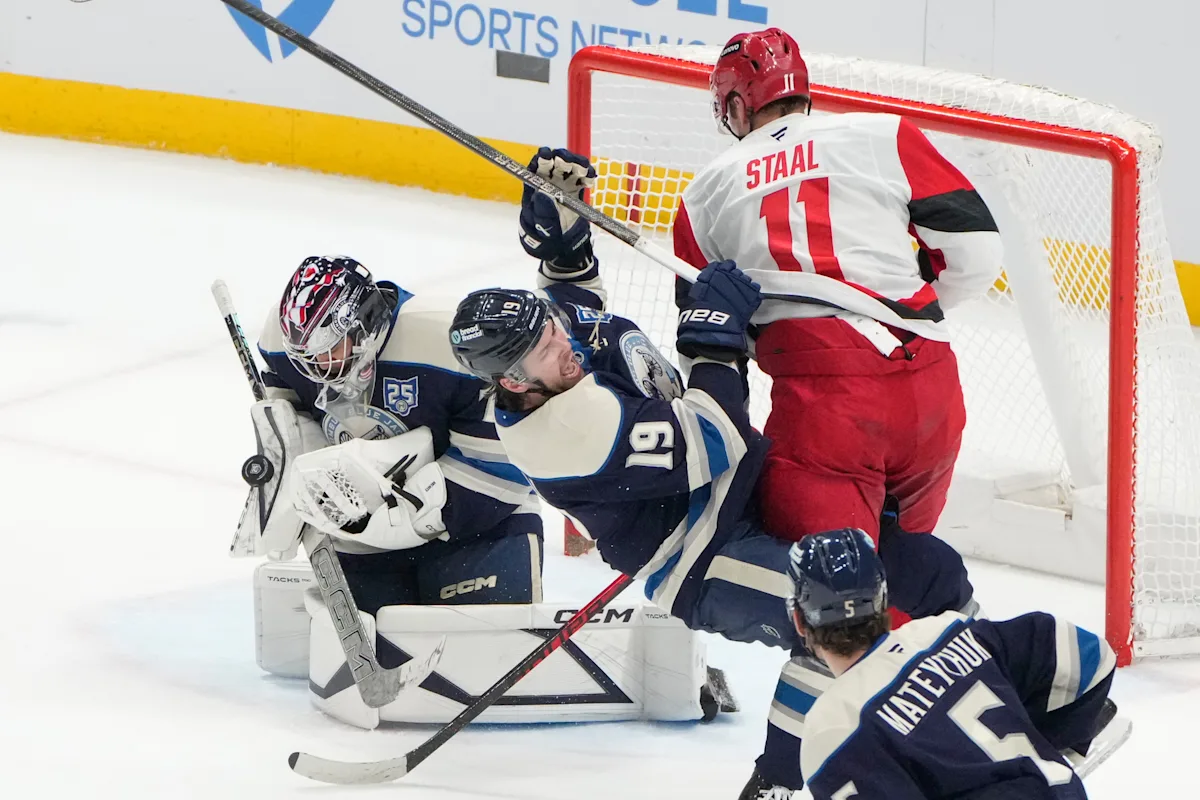 Carolina atinge a marca de 100 pontos e lidera o Leste com vitória por 5 a 2 sobre os Blue Jackets
