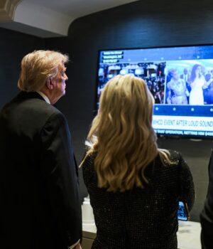 Uma foto mostra Levitt parado ao lado do presidente assistindo a uma transmissão de televisão no salão de baile.
