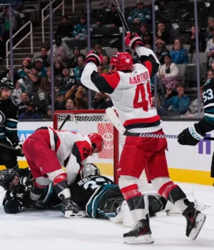 Shan Walker Shayen Gostisbeh e Jackson Blake também marcaram para o Hurricanes, que venceu três vitórias diretas para abrir esta temporada. Logan Stankoven teve duas assistências e Brandon Busi parou 16 arremessos em sua estreia na NHL.