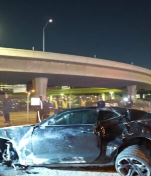 O rosto do motorista estava ensanguentado e ele ficou surpreso depois que os bombeiros de El Segundo o tiraram de um Chevrolet Camaro, como pode ser visto em um vídeo da agência de notícias independente OnScene.TV. O homem foi preso e internado no hospital.