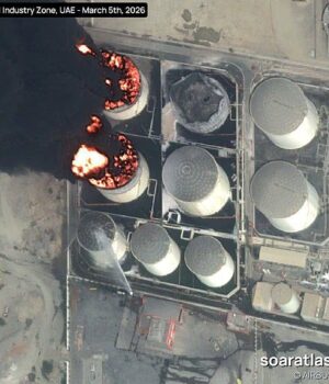 Sob ataque: imagens de satélite mostraram ontem um grande incêndio na zona industrial petrolífera de Fujairah, nos Emirados Árabes Unidos