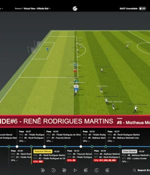imagens “gamificadas” geradas pelo sistema SAOT (em que os jogadores aparecem como avatares de videogame, mesmo vestindo o uniforme do clube) de jogadas difíceis de serem convocadas ocorridas durante partidas clássicas entre times cariocas. Em uma das imagens, durante ataque do Fluminense, o jogador René chega com o pé direito na frente do zagueiro Alex Telles, do Botafogo, cuja posição marca a linha de impedimento.