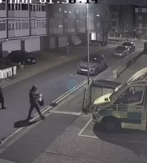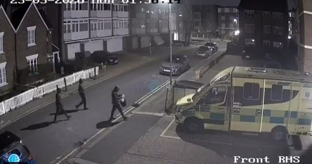 Imagens de CCTV mostram três suspeitos encapuzados patrulhando um Hatzola estacionado com latas antes de incendiá-lo.