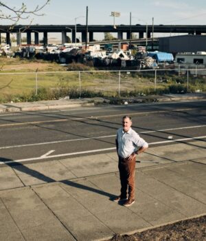 O advogado de uso da terra Robert Salna significa um retrato do lado de fora de uma cerca na estação de West Ouckland Bert, que estava originalmente agendada para a construção de moradias em Okland, Califórnia, 9 de abril de 2025. Salina está combatendo o uso do CEQA, uma lei ambiental que permite que o desenvolvimento do Estado impeça o estado de acomodação. (Don Feria para o Bay Area News Group)