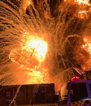 Um enorme inferno causou o caos no oeste de Sydney, quando uma bola de fogo vulcânica engolfou uma fábrica antes de explodir a 150 metros de altura e enviar destroços pelas ruas vizinhas.