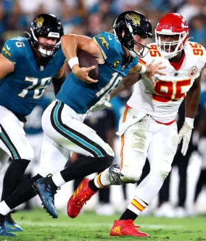 O quarterback de Jacksonville Jaguars, depois de tropeçar no backfield, de alguma forma conseguiu levar seu compositor de volta à última zona no último momento na noite de segunda-feira e ganhar uma vitória selvagem por 31-28 contra o Kansas City Chiefs. Isso deu aos Jaguares a terceira vitória direta e os empurrou para 4-1 por ano.