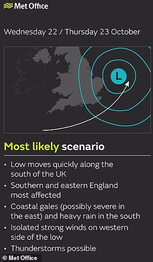 ‘Chuvas fortes e algumas rajadas fortes atingirão o sul do Reino Unido durante a noite de quarta-feira. Acumulações de 25 a 40 mm de chuva durante doze horas ou mais são possíveis nos condados do sul.