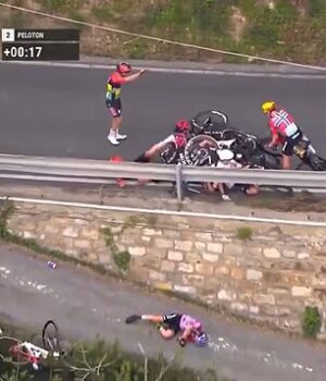 Ciclista levada ao hospital após grave acidente na corrida feminina – depois de cair sobre uma barreira na estrada