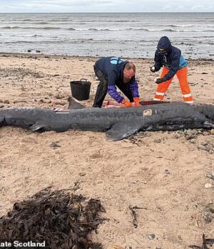 Um enorme tubarão de 12 pés (4,38 m) chegou à costa perto de Inverness, deixando os cientistas chocados.