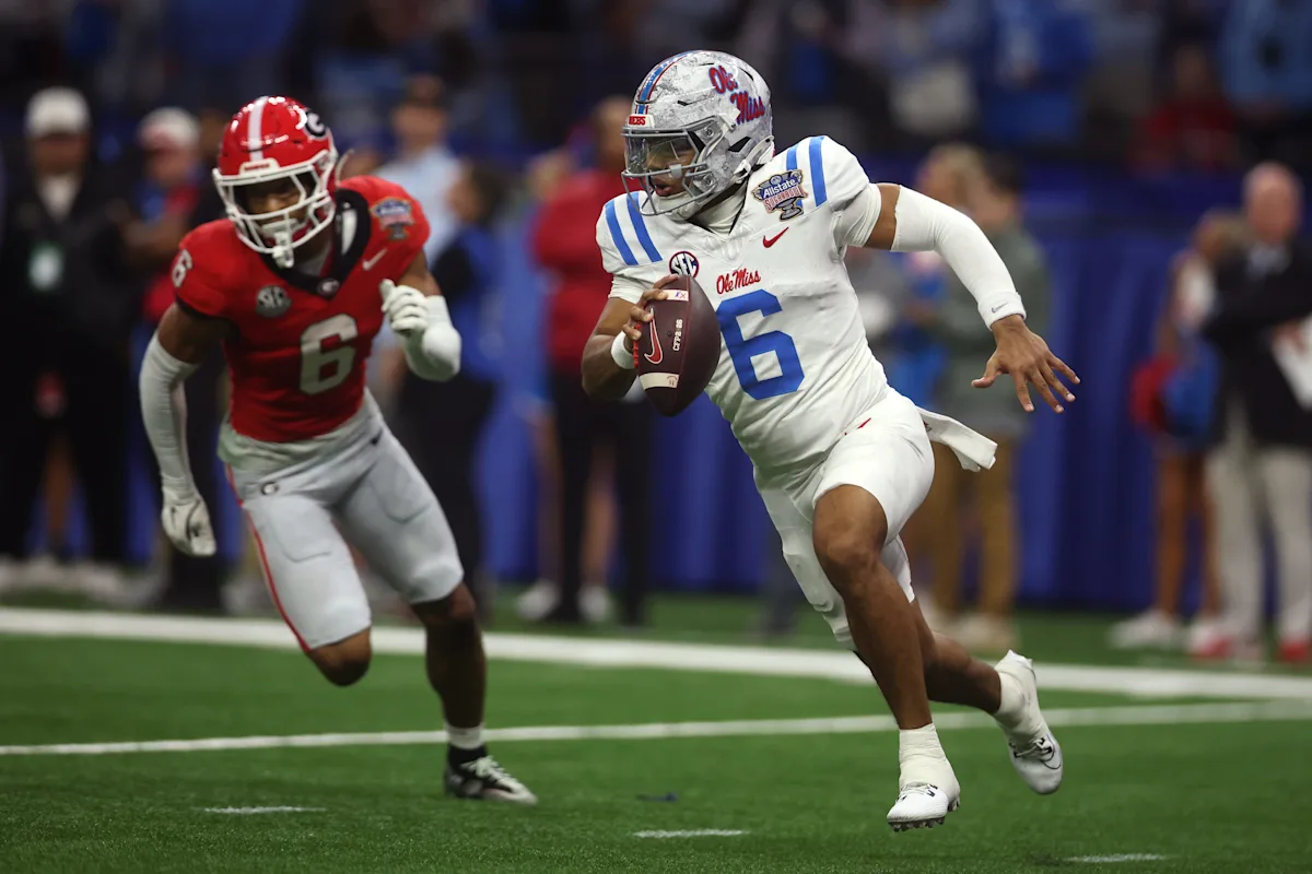 NOVA ORLEÃES, LOUISIANA – 01 DE JANEIRO: Trinidad Chambliss # 6 do Ole Miss Rebels dirige no terceiro quarto contra o Georgia Bulldogs nas quartas de final do College Football Playoff de 2025 no Allstate Sugar Bowl em janeiro de 2061 em Caesars, Louisiana. (Foto de Chris Grethen/Getty Images)