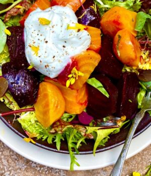 Lemon chicote as equipes de Ricota com pedaços assados doces nesta animada salada de primavera. À medida que as batidas são cozidas, seu suco de barro sai na panela e se mistura com o glamour generoso usado para cobrir as mordidas. É importante armazenar esse suco após a torrefação, pois será adicionado ao molho.