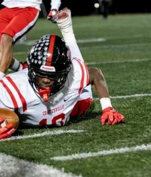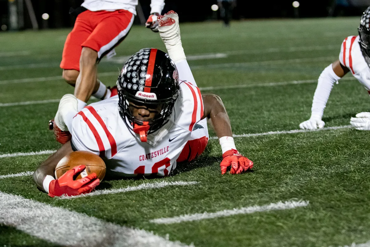 O linebacker de Coatesville, Terry Wiggins, recupera um fumble que saiu de campo, permitindo que Pennridge mantivesse a posse de bola em um jogo de playoff da semifinal Classe 6A do Distrito Um na sexta-feira, 14 de novembro de 2025, no Helman Field em Perkasie. Com a vitória por 17-14, os Rams avançaram para as finais distritais.