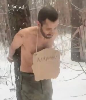 Em janeiro, surgiu um vídeo mostrando um combatente russo preso de cabeça para baixo contra uma árvore, no frio cortante, perto da linha de frente.