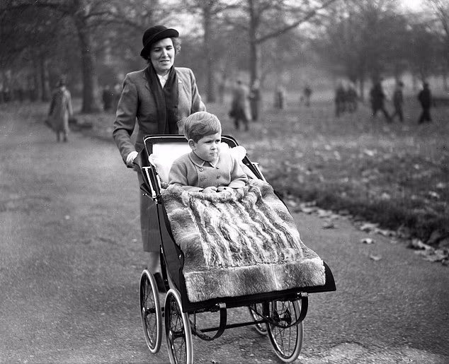 Na foto em 1950: O então Príncipe de Gales, de dois anos, assiste a uma procissão com a Sra. Anderson