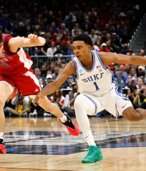 Emergindo pela porta estava Caleb Foster, o coração e a alma do número 1 geral do torneio da NCAA, o Duke Blue Devils, com a perna direita apoiada em uma scooter de duas rodas, o tornozelo e o pé – descalços e sem meias – embrulhados em plástico bolha. Ele colocou seu transportador ao pé do palco elevado, subiu as escadas e sentou-se visivelmente exausto em uma cadeira de espera.