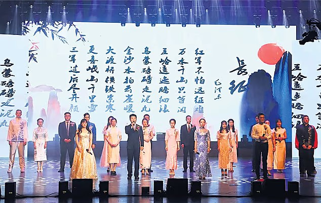 Christopher Cash (extrema direita) e seu amigo Christopher Berry (extrema esquerda) são retratados no palco de um evento escolar na China, onde trabalhavam como professores.