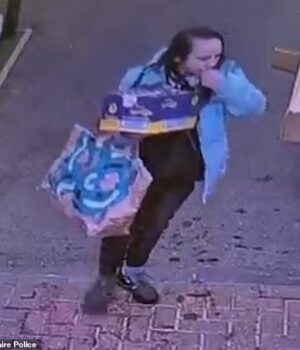 Leah Harding (foto), 37, roubou 64 caixas de doces do Barn Garden Center em Peterborough. A certa altura, ele é visto batendo em um ovo