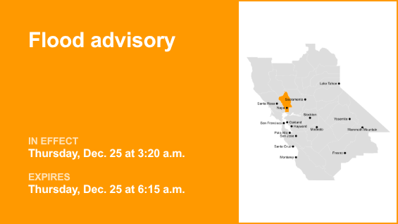 O condado de Napa está incluído em um alerta de enchente emitido pelo Serviço Meteorológico Nacional às 3h20 de quinta-feira. O aviso permanece em vigor até às 6h15.