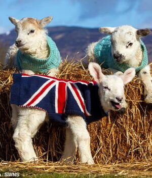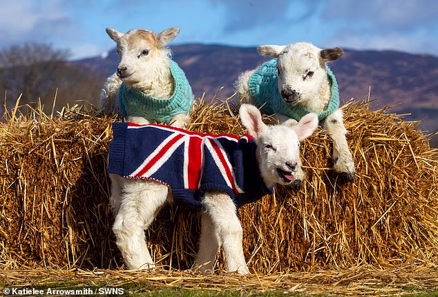 Fotos adoráveis mostram cordeiros em moletons tricotados por voluntários, com Jackie ganhando um elegante pulôver Union Jack este ano.