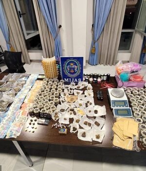 Falando sobre as drogas e outros itens apreendidos, ele acrescentou: “Durante a operação policial, foram apreendidos dois sacos de maconha pesando 489 e 681 gramas, respectivamente, juntamente com um saco de resina de haxixe pesando 865 gramas e 164 cigarros de maconha prontos para venda.