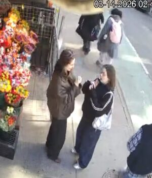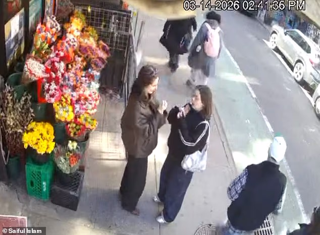 Duas mulheres são vistas conversando enquanto se maquiam em uma calçada em Manhattan