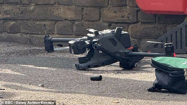 Durante a operação, ele bateu em um fio suspenso e caiu no chão, atingindo uma criança e ferindo sua mão. Os feridos foram tratados em um hospital de Londres.