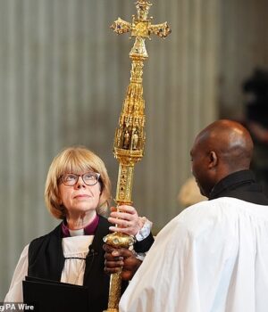 A primeira mulher nomeada para o cargo máximo da Igreja da Inglaterra foi oficialmente confirmada ontem, embora um questionador tenha interrompido a cerimônia.