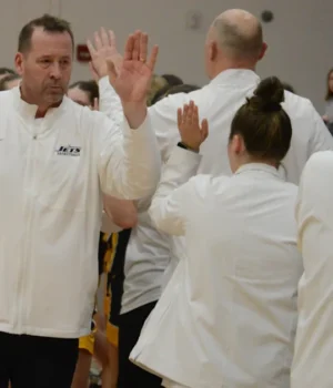 O técnico de basquete feminino do aeroporto, Darrell Mossberg, cumprimenta seus assistentes técnicos após uma vitória por 68-60 sobre o Dearborn Divine Child nas finais regionais da Divisão 2 no Divine Child em 11 de março de 2026.