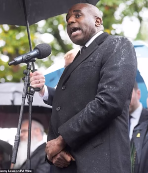 Lammy, que impôs restrições à venda de armas a Israel como secretário de Relações Exteriores no último ano, e convocou seu embaixador duas vezes para criticar o conflito em Gaza, que reuniu centenas de pessoas na chuva para prestar homenagem às vítimas.