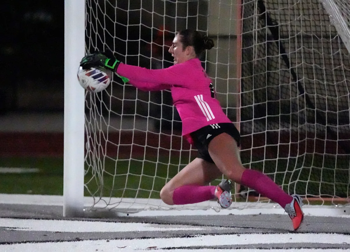 A goleira do Lakewood Ranch, Ava Shirley (#00), faz a defesa da vitória em um pênalti de morte repentino. Lakewood Ranch recebe East Lake para o campeonato regional de futebol feminino Classe 3A-3 na noite de terça-feira, 17 de fevereiro de 2026. Lakewood Ranch venceu após duas rodadas de prorrogação dupla e pênaltis.