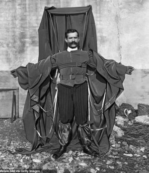 Ele montou uma alfaiataria especial feita de seda e borracha. Teoricamente, ele disse que uma pessoa caída poderia abrir suas armas para fazer suas asas de ascendência que seriam descendentes.