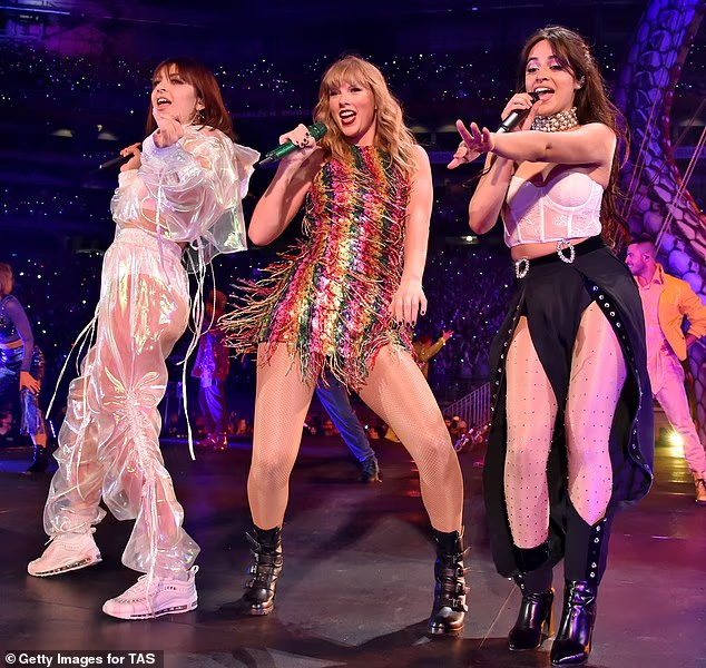Camilla Cabello, Taylor Swift e Charlie XCX Taylor Swift pose no palco antes de abrir os passeios do estádio de 2018