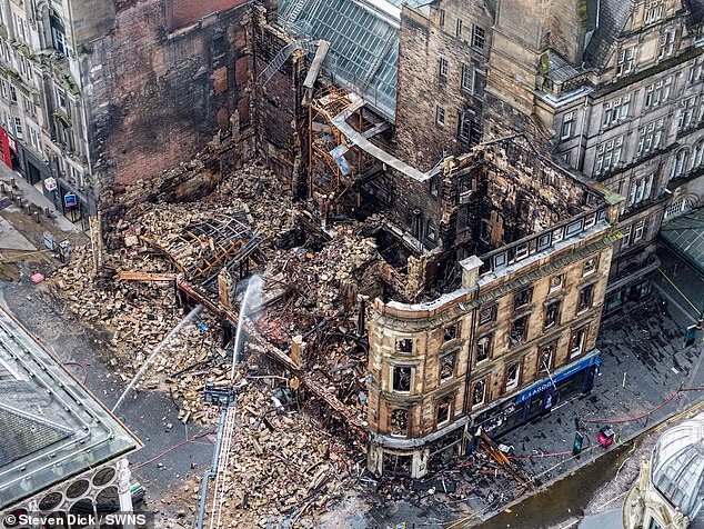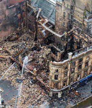 Apenas a fachada da seção Gordon Street do edifício – famosa por gerações de habitantes de Glasgow por sua cúpula distinta – permaneceu de pé depois que o marco do século 19 foi destruído por um incêndio no domingo.
