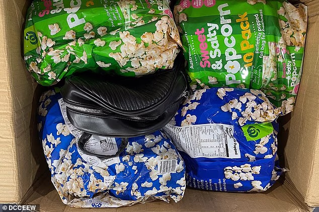Neil Simpson, 61 anos, foi preso por oito anos por tentar contrabandear répteis australianos em sacos de pipoca (acima) e latas de biscoitos.