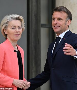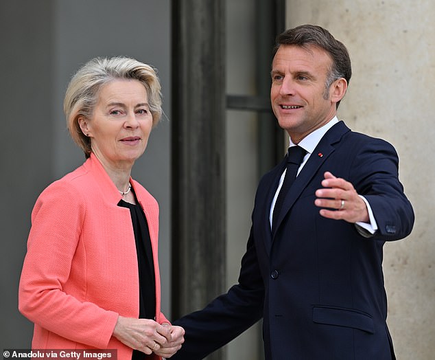 Presidente da Comissão Europeia, Ursula von Deer Lane, e o presidente francês Emmanuel Macron na segunda -feira antes de sua reunião em Paris Elis
