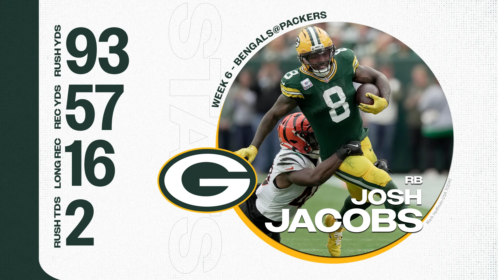 Jacobs ficou mais forte do que nos últimos dois jogos, a pelo menos 150 jardas do delírio em ambas as partidas. No domingo, seu Rushing Yards identificou o auge de uma temporada, já que ele tinha 5,2 jardas por altura. Jacobs também continuou sua forte temporada como receptor de passes na defesa, conseguindo mais cinco passes para 57 jardas. Ele foi capaz de ampliar a liderança com dois touchdowns corridos, elevando o total para seis na temporada. O Packers Run Game não entrou em vigor como há um ano, mas aproveitou a difícil defesa do Bengal esta semana.