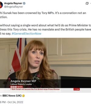 Um dia antes de Sunak ser anunciado como o novo primeiro-ministro, Lisa Nandy – que agora é secretária da Cultura – disse que os britânicos “não precisam de um novo líder conservador, precisamos de eleições”.