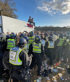 A polícia de choque teve garrafas e latas de plástico atiradas contra eles pela multidão “violenta e hostil” enquanto tentavam impedir o evento e o seu enorme sistema de som que tocava música trance alto o suficiente para acordar moradores locais adormecidos a oito quilómetros de distância.