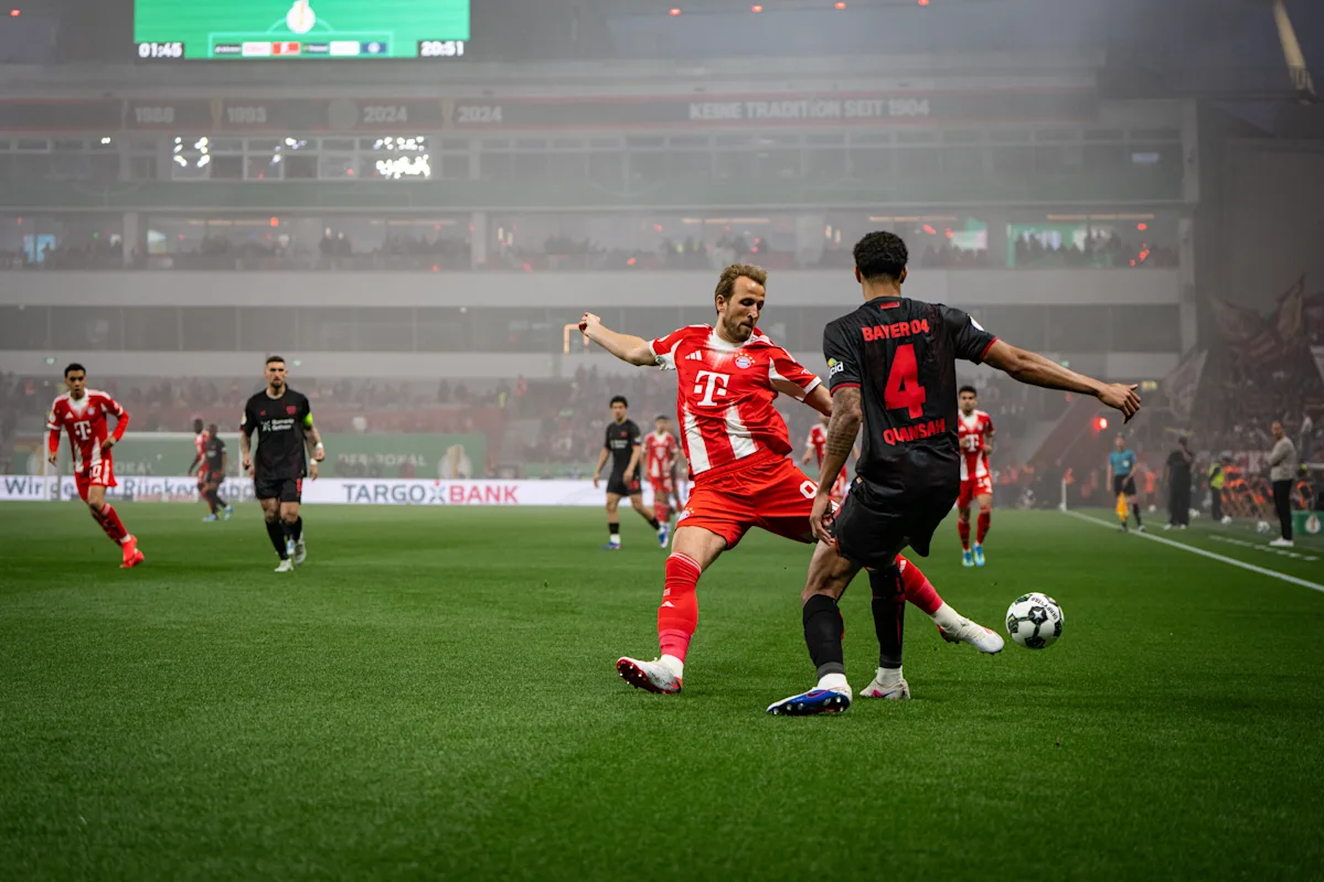 LEVERKUSEN, ALEMANHA – 22 DE ABRIL: Harry Kane do FC Bayern München com a bola durante a partida semifinal da Copa DFB entre Bayer 04 Leverkusen e FC Bayarn München na BayArena em 22 de abril de 2026 em Leverkusen, Alemanha. (Foto de S. Meller/FC Bayern via Getty Images) | FC Bayern via Getty Images