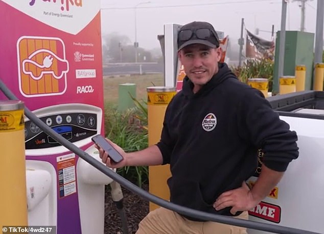 “Obviamente, tenho um alcance de 800 km, tenho 100 km fora de Brisbane, recebi um quarto de combustível e estou fora da bateria”, disse ele em um vídeo postado na popular conta do YouTube, 4WD 24/7O
