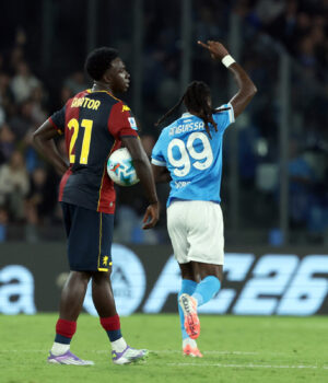 Nápoles, Itália -9 de outubro: O SSC Napoli Frank Anguisa SSC Napoli e Genoa CFC comemoraram o primeiro gol durante a partida em Diego Armando Maradona em 05 de outubro de 2025, 2025 na Itália. (Foto de Francesco Pacoro/Getty Fig.)