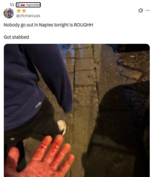 Dois torcedores do Chelsea foram “perseguidos por 25 ultras” e esfaqueados em Nápoles na noite passada, com uma vítima compartilhando uma foto de suas mãos encharcadas de sangue.