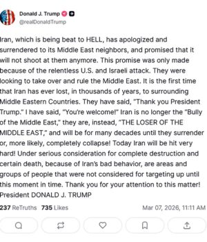 Numa declaração da Truth Social no sábado, Trump ridicularizou o Irão como o “perdedor do Médio Oriente”, enquanto os EUA exigiam uma rendição “incondicional” e ameaçavam agravar o conflito que começou há oito dias.