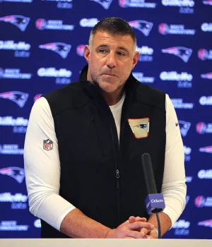 Mike Vrabel se reuniu com a mídia menos de uma hora antes do início do Draft da NFL. (Foto de John Tulumaki/The Boston Globe via JT Images)