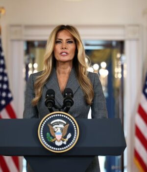 Num fato de negócios cinzento, Melania Trump aproximou-se do pódio e, num tom gélido, falou não sobre um esforço de caridade, como normalmente é apropriado para uma primeira-dama, mas sobre um pedófilo condenado.